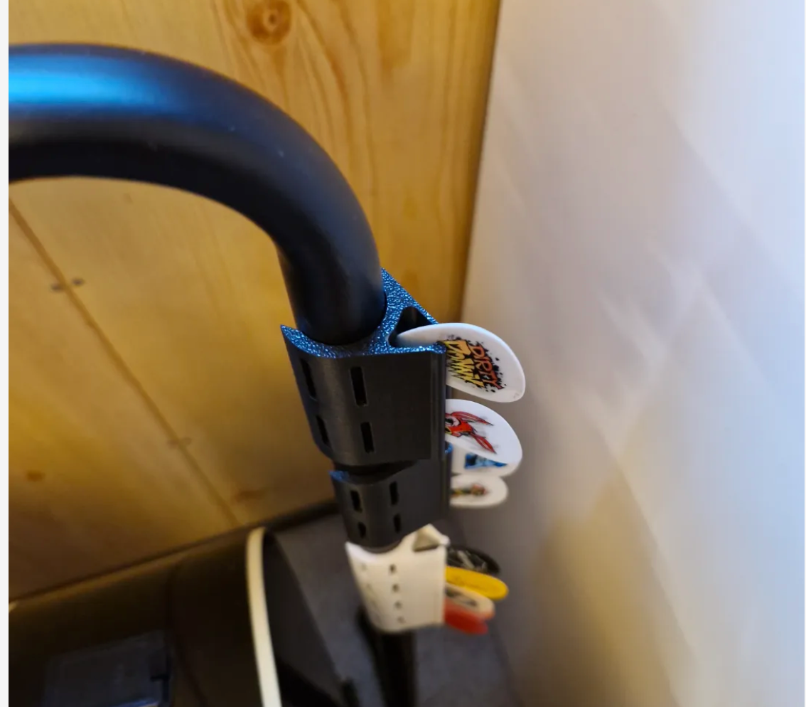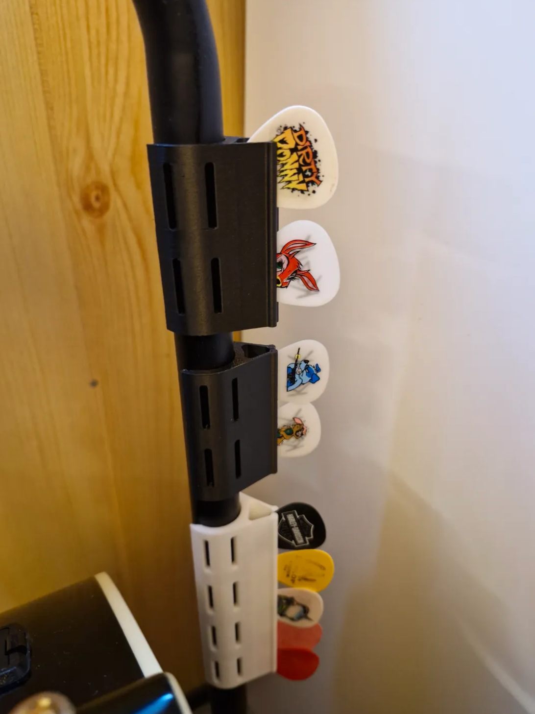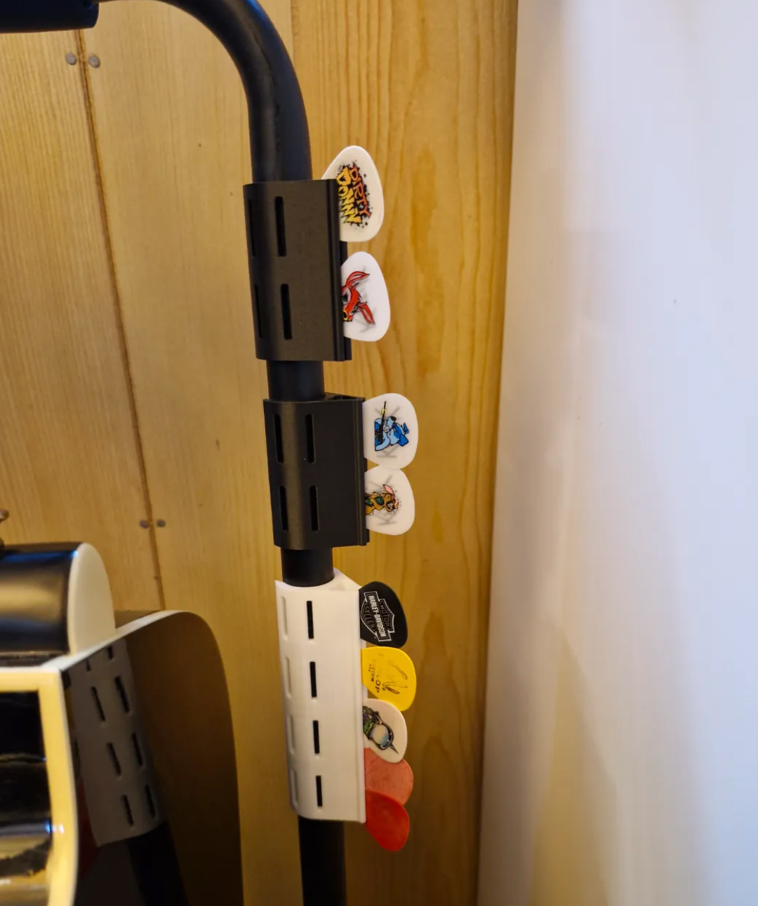 Clips on to any standard mic or guitar stand. Picks slide right in. Lightweight and easy to take with you on any gig. 3D Printed in house. Holds 2+ or 5+ picks.